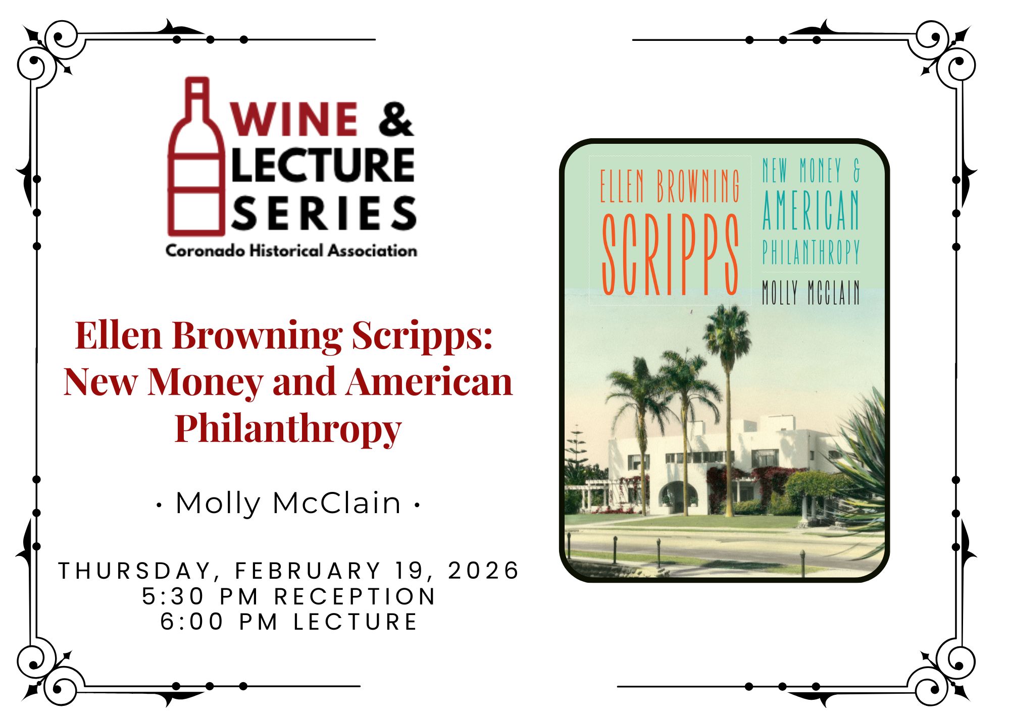 Important Registration Information: Reservations are required. Please be aware that tickets for the wine & lecture events are nonrefundable, as proceeds support our educational mission. If you have any questions, please email info@coronadohistory.org or call (619) 435-7242.